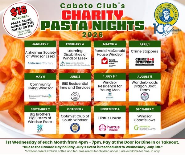 The Caboto Club has generously picked the Windsor & Essex County Crime Stoppers as their charity of choice for their pasta dinner fundraiser for the Month of April 2026!